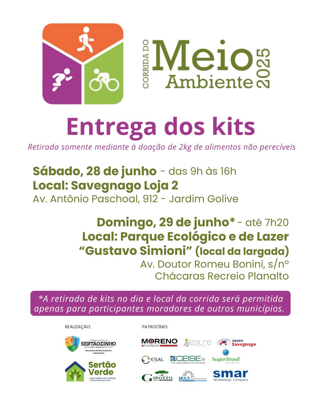 Atenção para as informações sobre a entrega dos kits aos participantes da Corrida do Meio Ambie