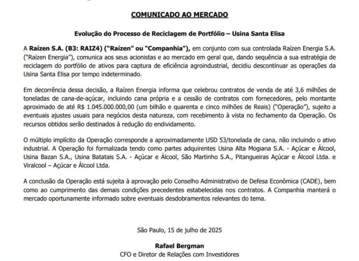 Fim de uma era: Raízen anuncia fechamento da Usina Santa Elisa em Sertãozinho nesta terça feira